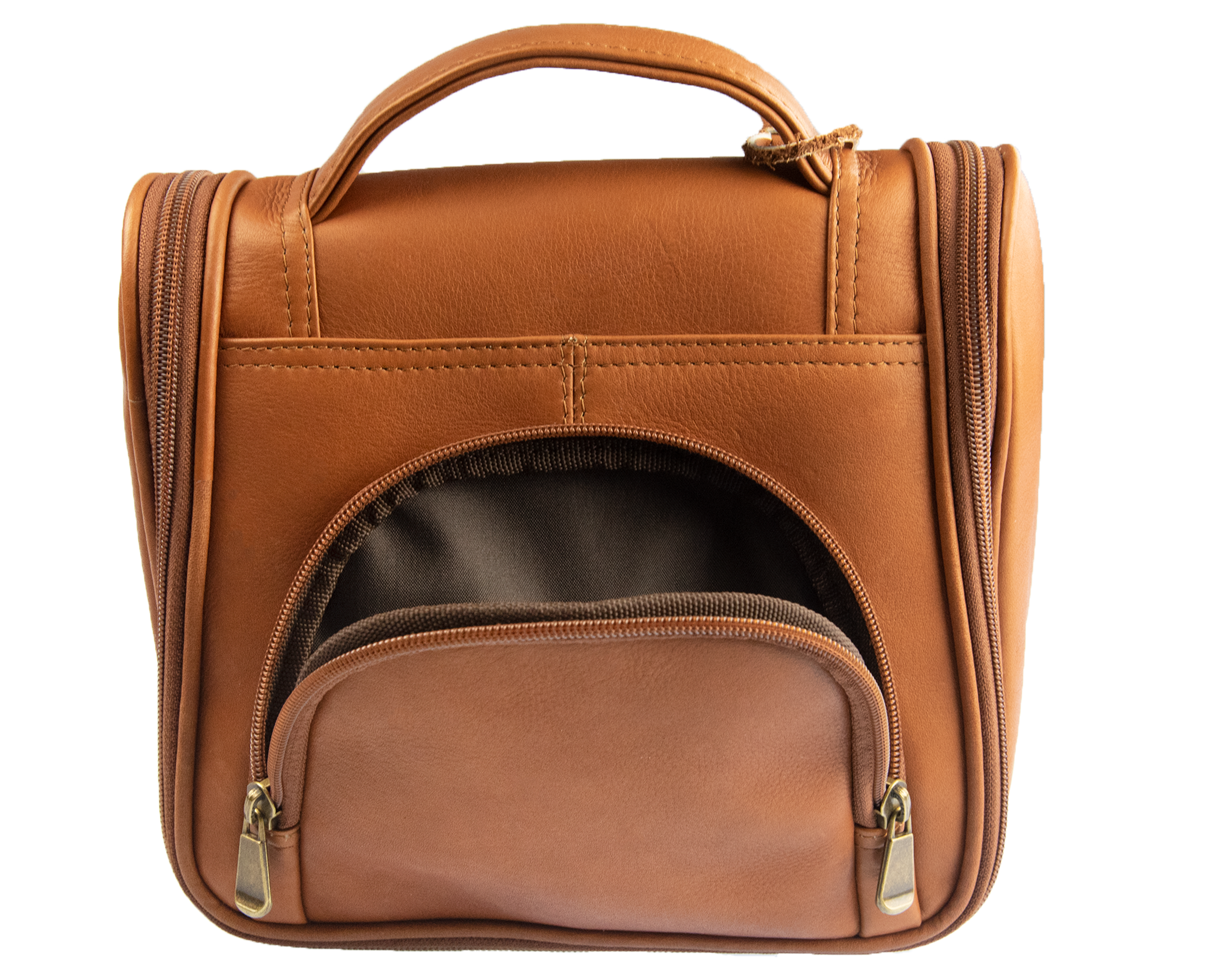 The stylish and compact Andrés leather hanging dopp kit is the perfect travel companion to meet your every need. Whenever you feel like wandering the world this product is crafted from top grain cowhide leather and durable, easy to clean, Mocha Brown Nylon Lining. The Andrés not only keeps your luggage light, but exceptionally well organized as the pockets can fit everything securely like larger shaving kits and deodorant sticks to small creams and tweezers. It is accented with antique brass-finish hardware.