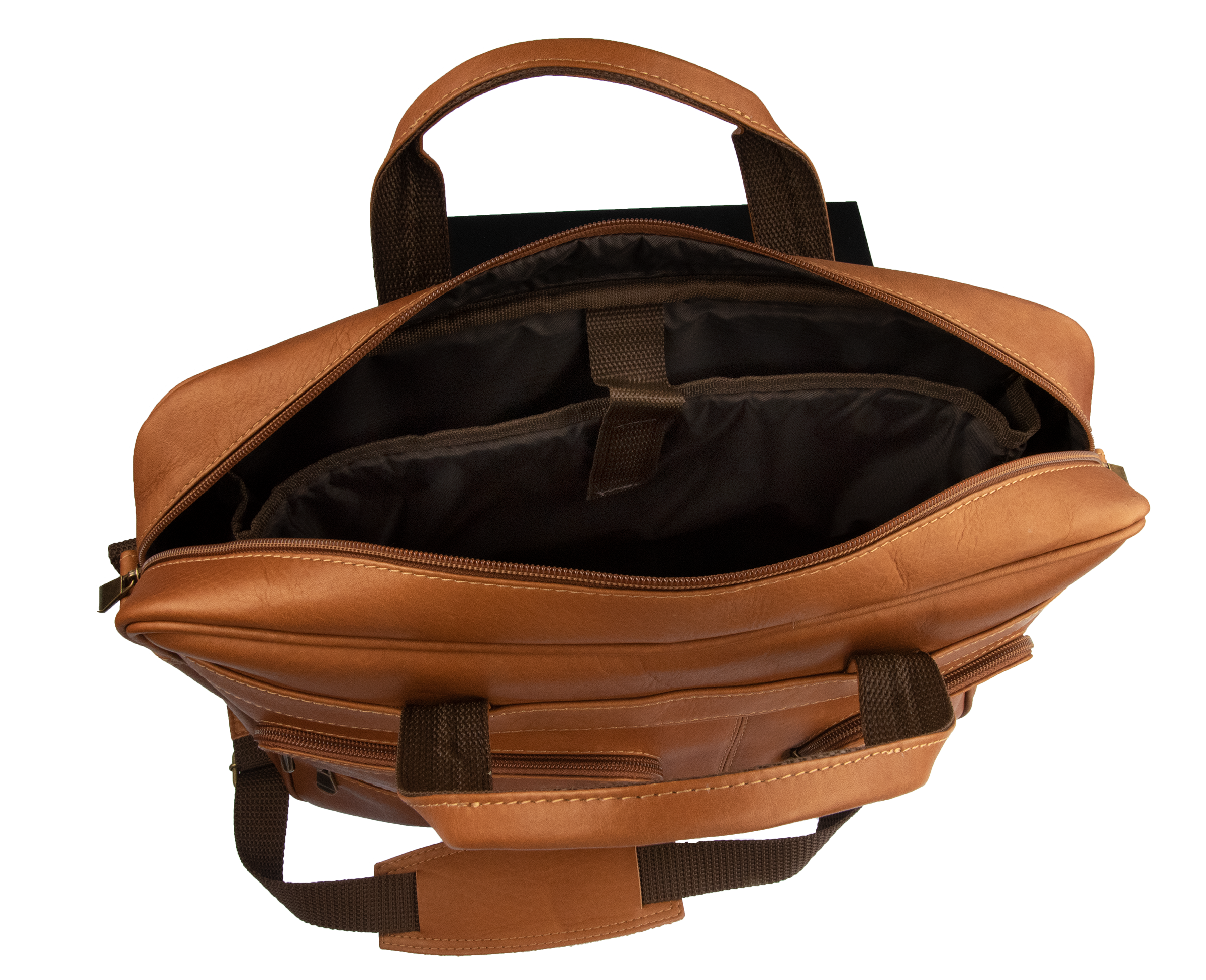 The Cima is a super-organized bag with compartments for all your stuff, including a 14” laptop. This case is crafted from top grain Colombian cowhide leather in saddle tan with a durable mocha brown nylon lining and a woven nylon shoulder strap. It is accented with antique brass-finish hardware.